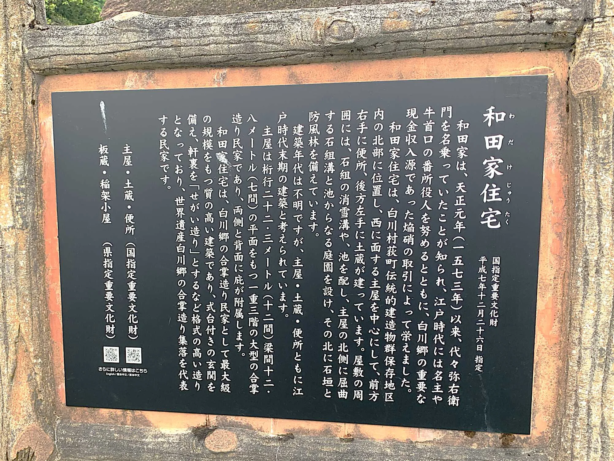 荻町の合掌造り家屋の中で、特徴的なのは和田家住宅である。これは江戸時代に塩硝の取引で栄えた名主の家で、国の重要文化財に指定されている。江戸時代末期の建築と推測され (略) 有力者の家屋であるため他よりも大きく、特別な客を迎えるための式台が存在している点で通常の合掌造り家屋と顕著に異なる。■ 相倉集落