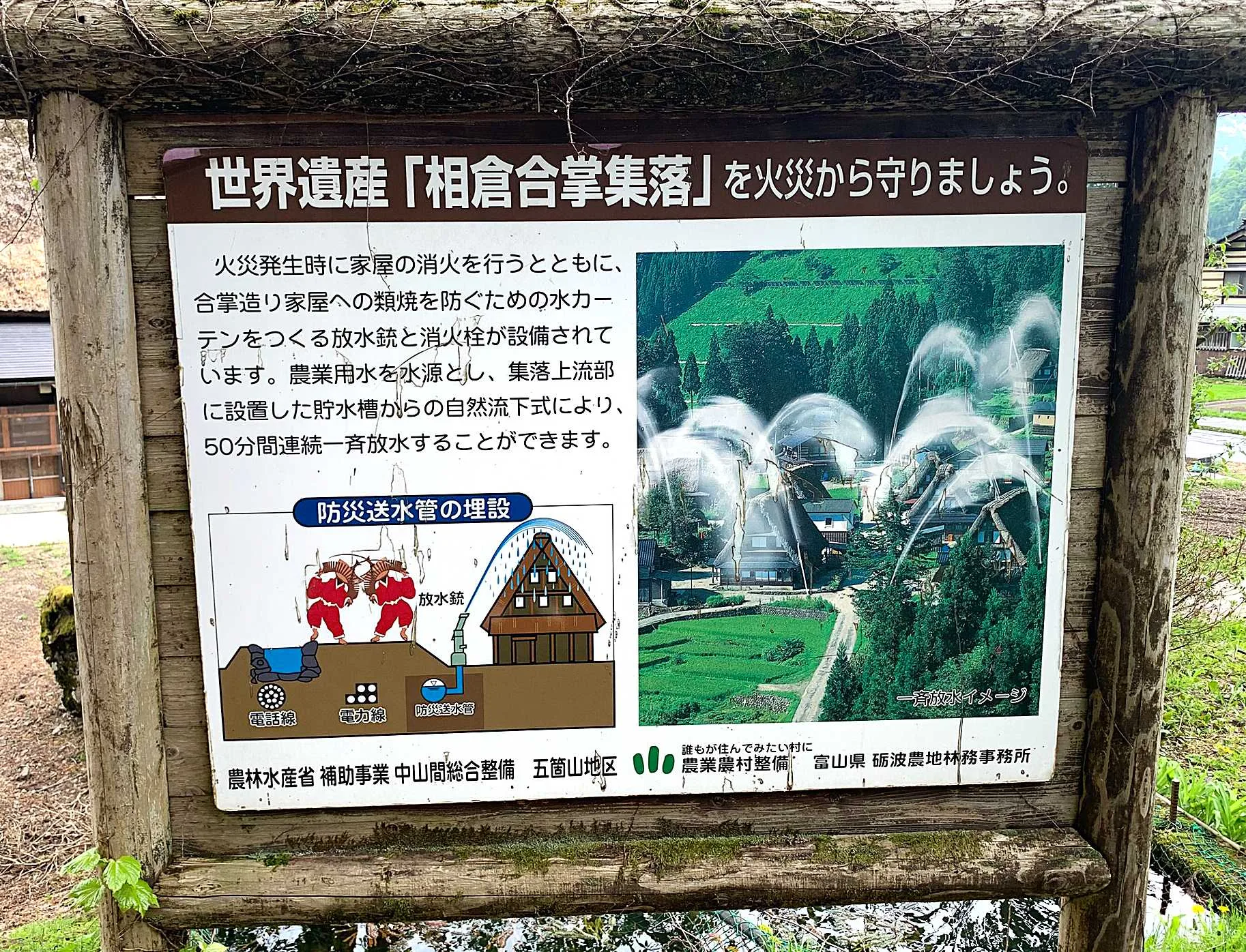 世界遺産登録後も、独特の景観を守ろうとする努力は行なわれている。茅葺きの木造建築という特徴から、もともと火事に対する意識は高く、荻町地区では「組」単位で1日に3回(昼、夕方、21時)、「火の用心」を呼びかけて見回りを行っている。また、当番を決めておいて23時に集落全体を見回る「大まわり」も実施されている。荻町には重要伝統的建造物群保存地区選定後に設置された放水銃も50基以上あり、毎年秋に一斉放水する訓練が行われている。