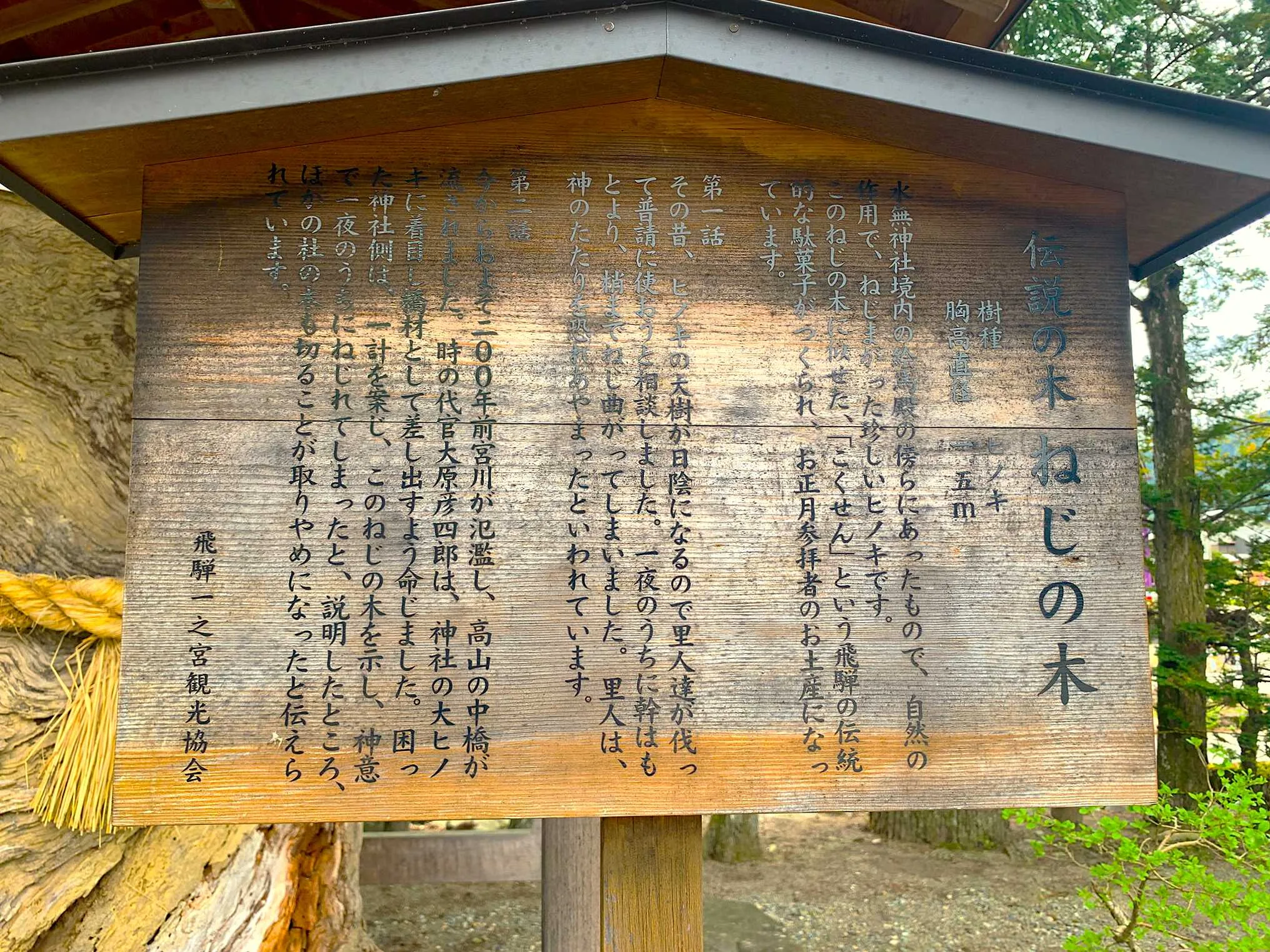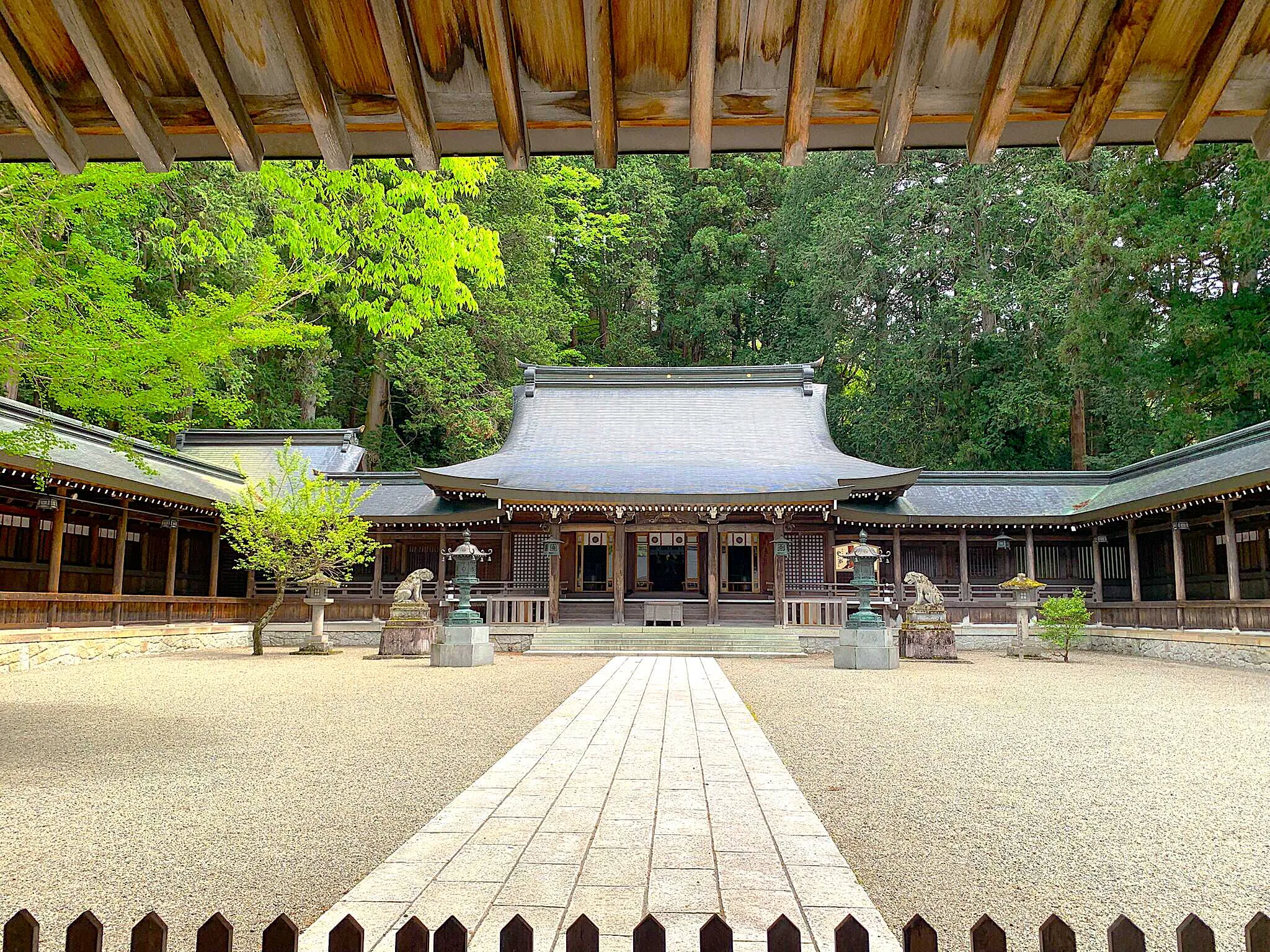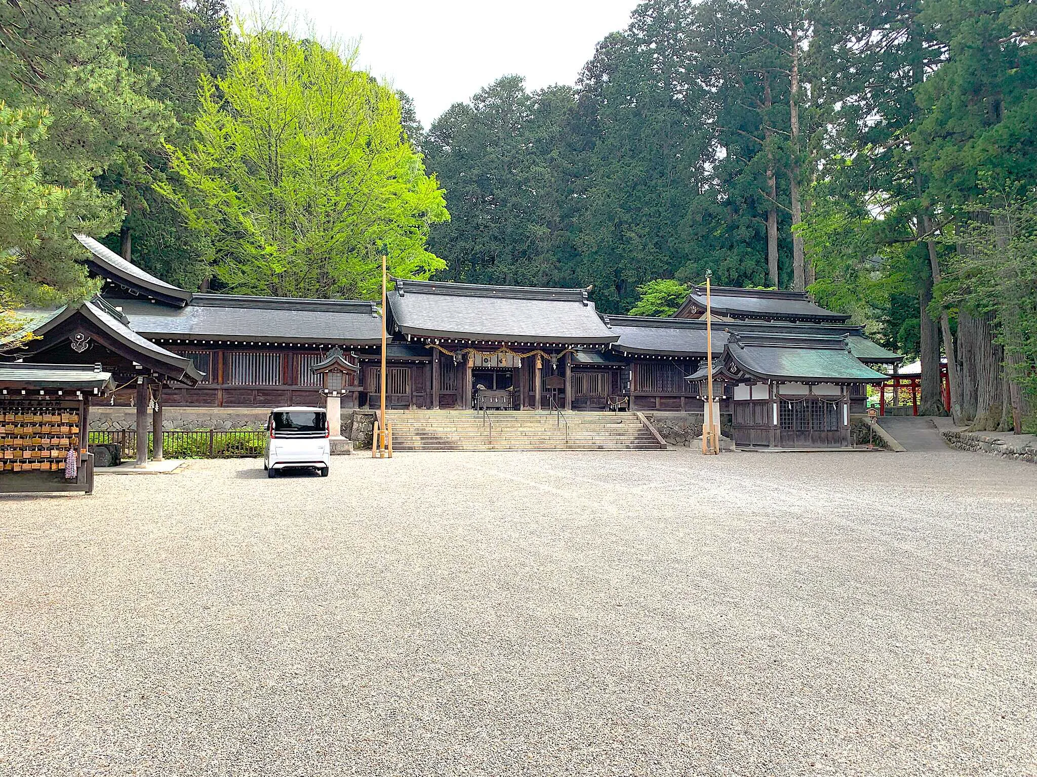 拝殿・本殿、御神木、境内の巨木群、摂社・末社、飛騨の自然と調和した社叢などが見どころです。