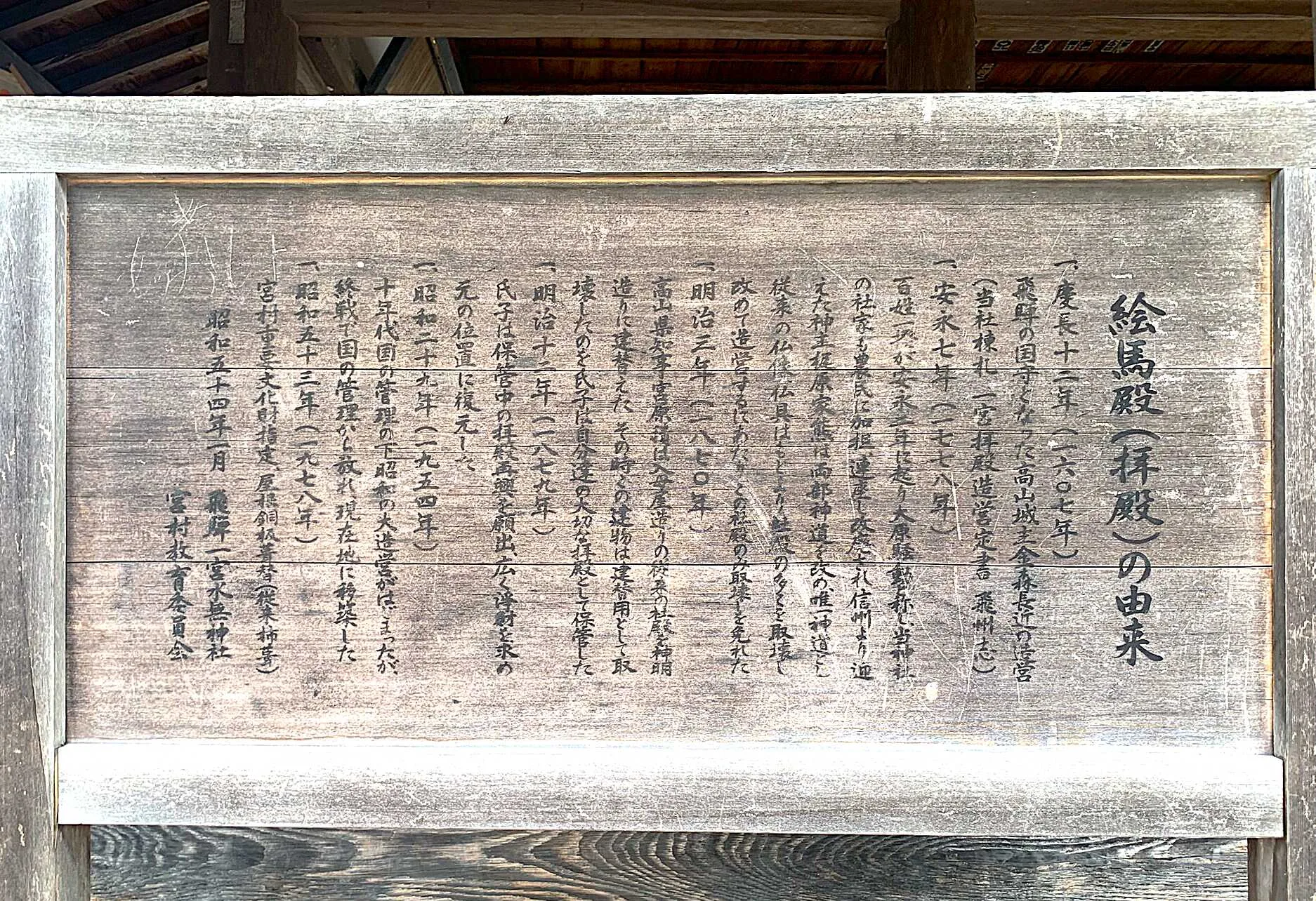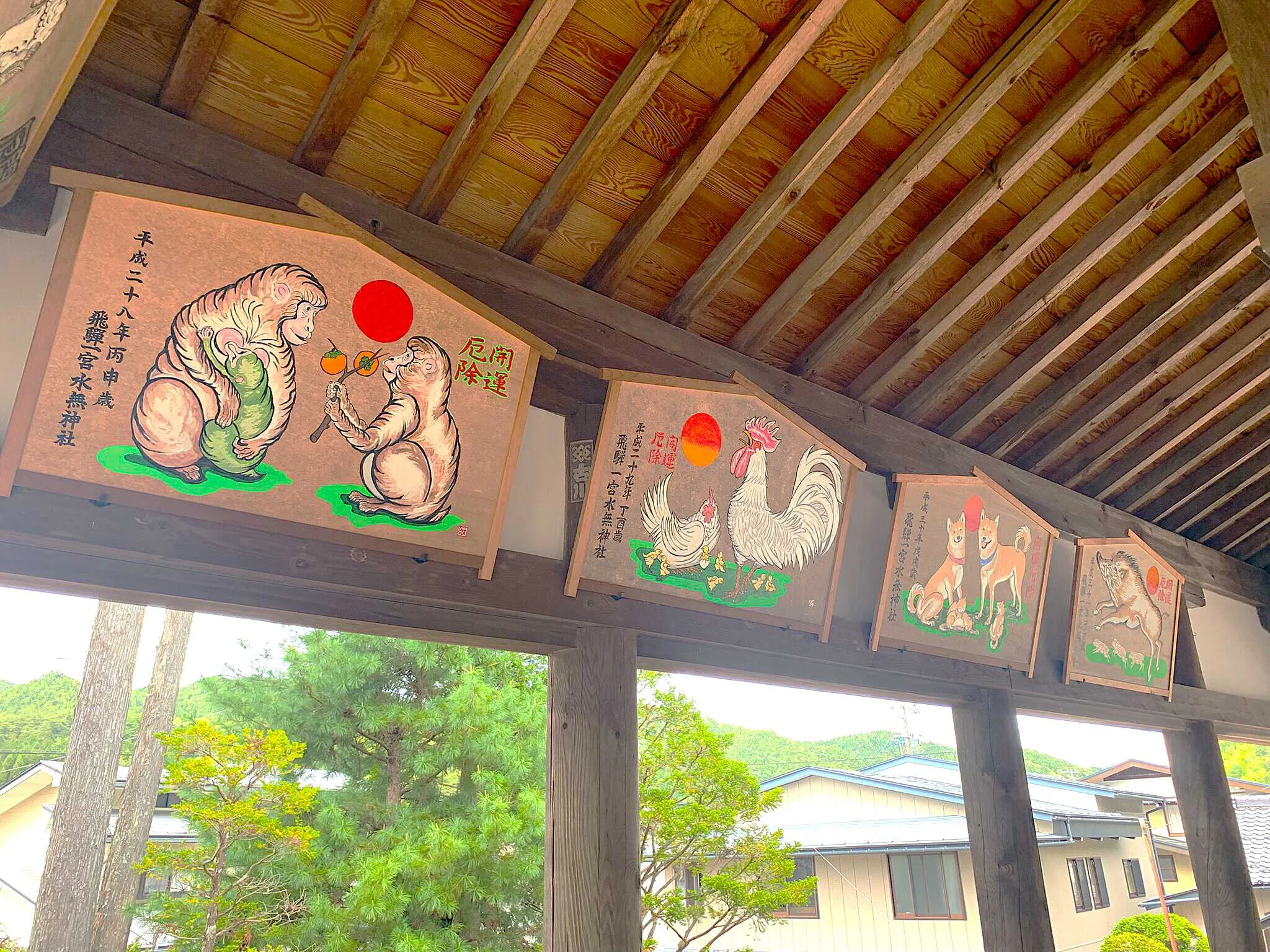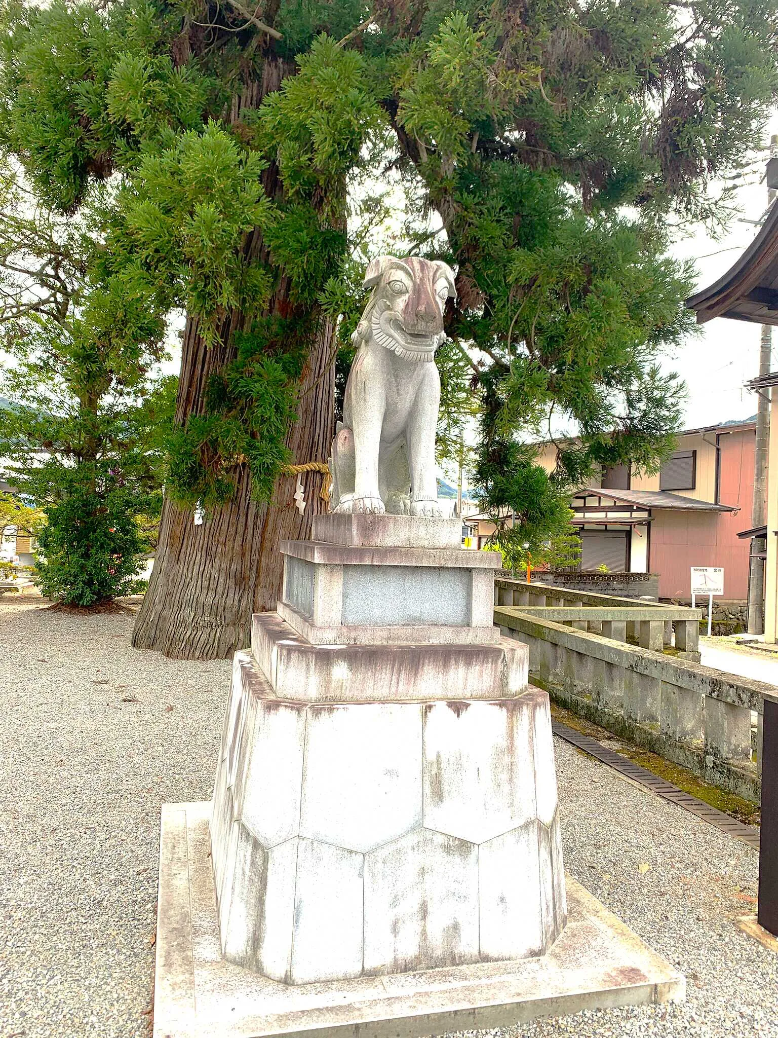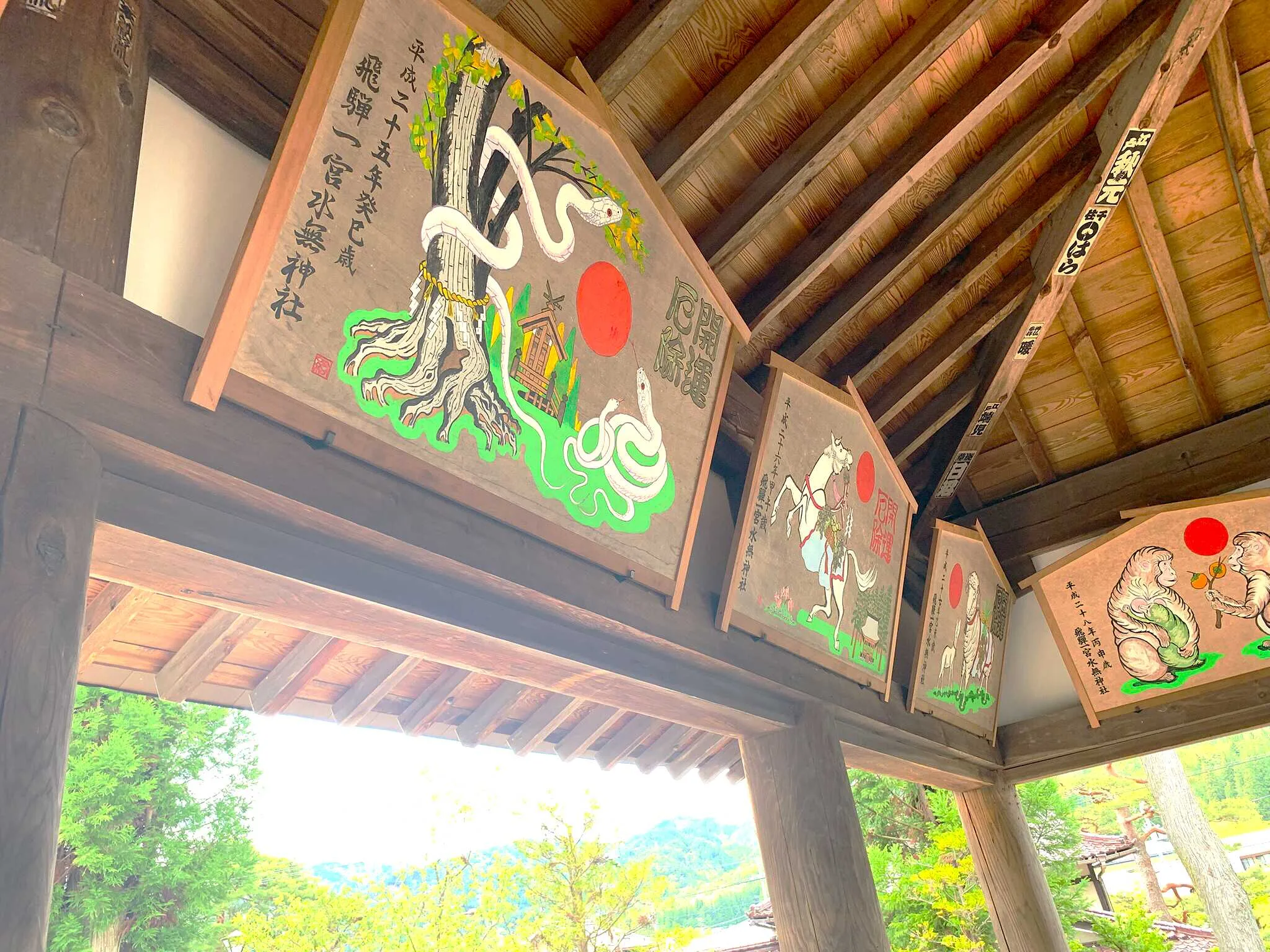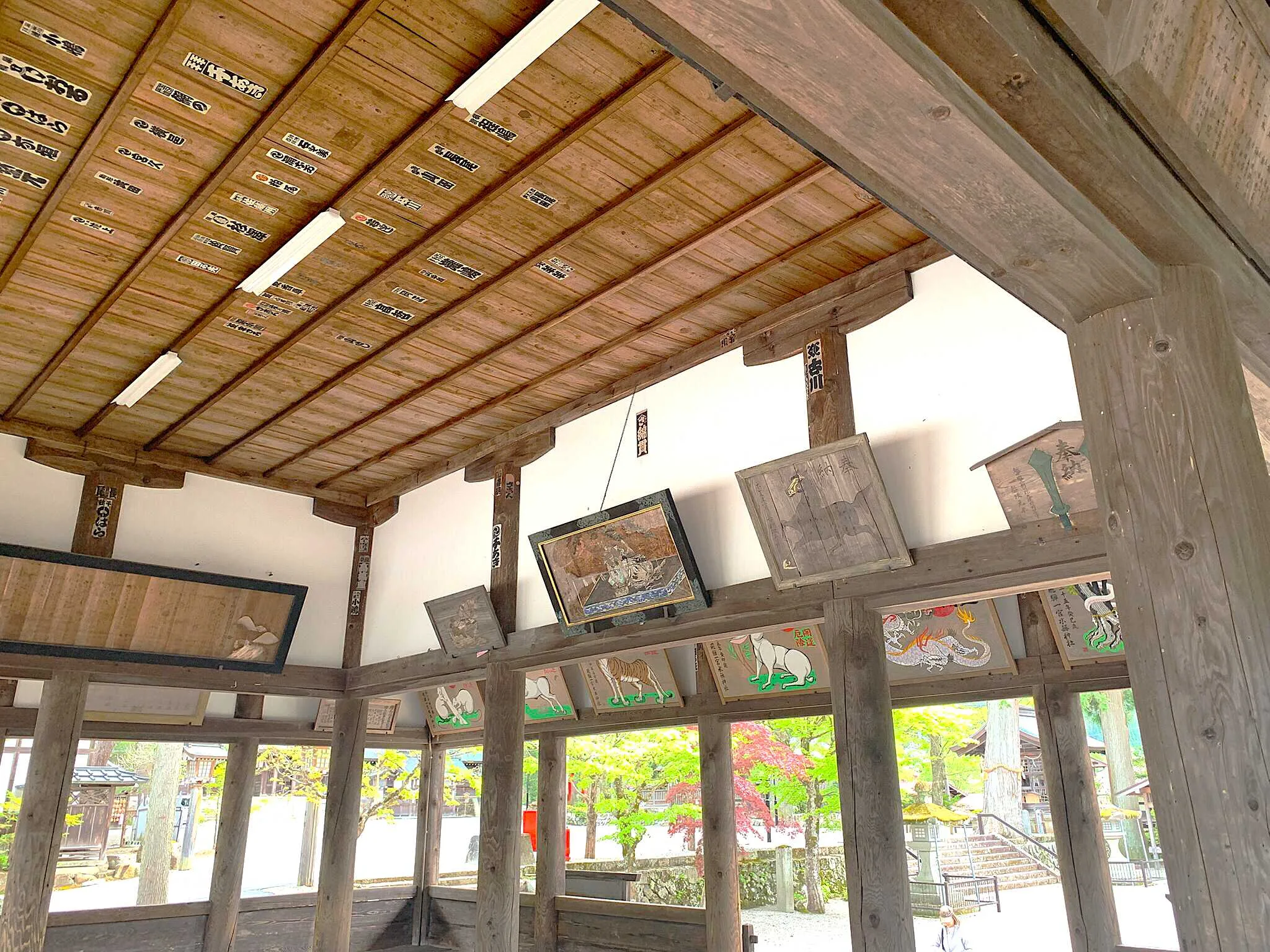 実際に、「神橋」付近の参道に立ち、「鳥居」方面を拝見すると、さすが「飛騨一宮」。中々の風格を備えた神社だと認識でき、ユニークなお姿の「狛犬」がお出迎えしてくれます。「鳥居」の向かって左側には「国幣小社」の標柱もあり、「社格」を感じる事が出来、その奥には、立派な「絵馬殿」があります。また「絵馬殿」の内部も中々見応えがある「大きな絵馬」がいくつもあり、「飛騨一宮」の風格を感じさせてくれます。