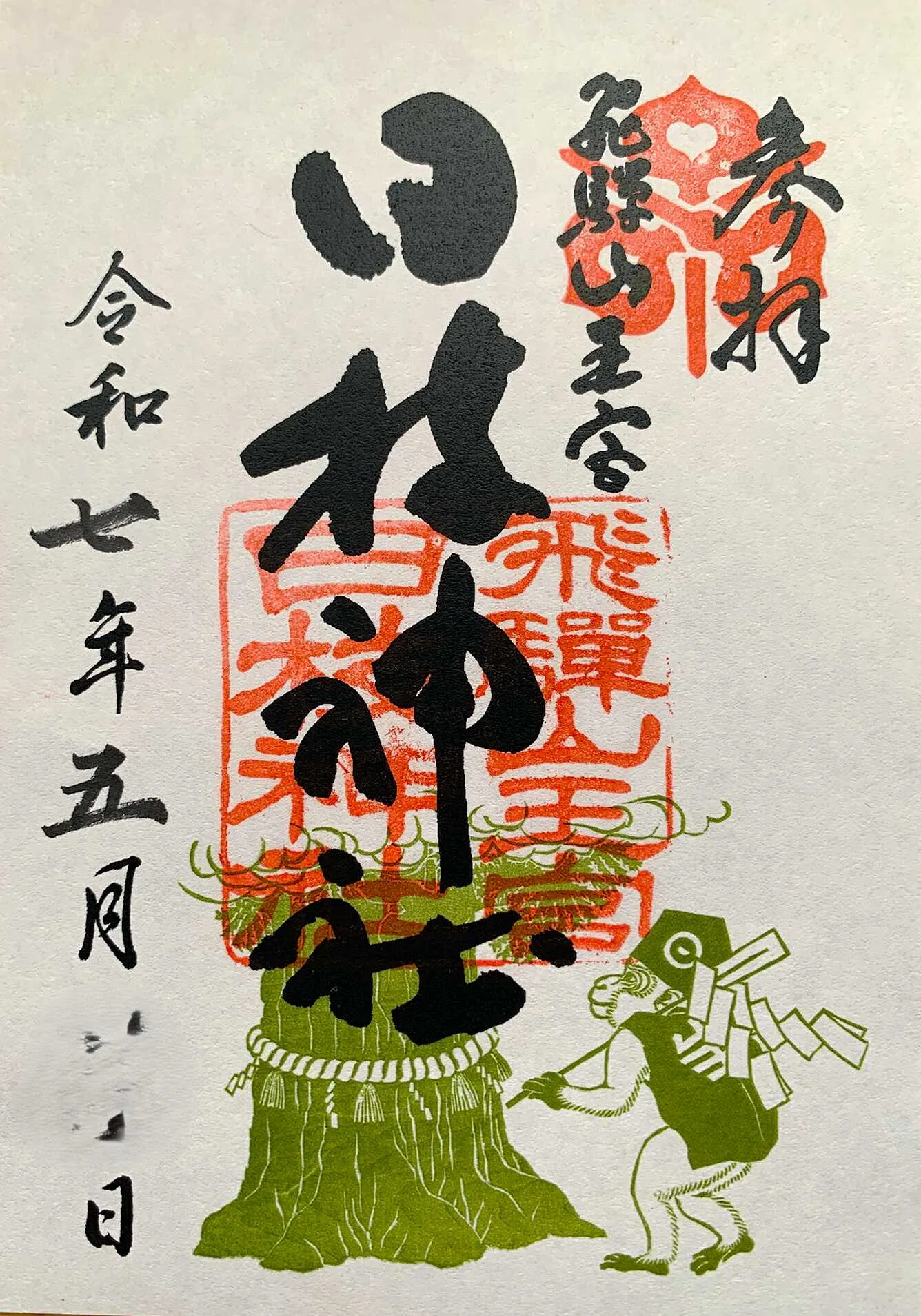 「稲荷神社」でご挨拶申し上げた後は、再び「二の鳥居」がある段まで降り、二の鳥居の脇にある「社務所」で、「御朱印」を頂戴しました。「日枝神社・山王信仰」であれば、「”神使” は “お猿さん” の理解なので “狛猿” いらっしゃるかな?」なんて思いつつ、「大人散策@飛騨山王宮 日枝神社」を開始し、途中「狛牛」・「狛狐」にも出会って散策を楽しみましたが、「狛猿」を見つける事はできませんでした。しかし、頂戴した「御朱印」にしっかり「お猿さん」がいらっしゃり、「これにて、「大人散策@飛騨山王宮 日枝神社はコンプリート!」と思った次第でした。