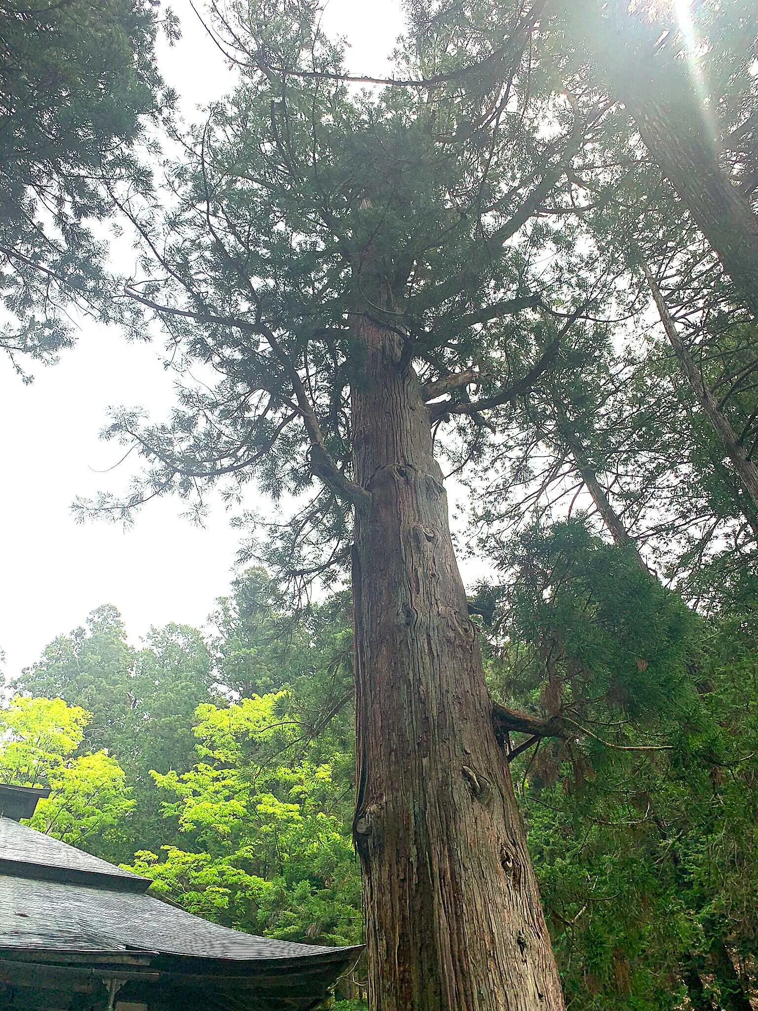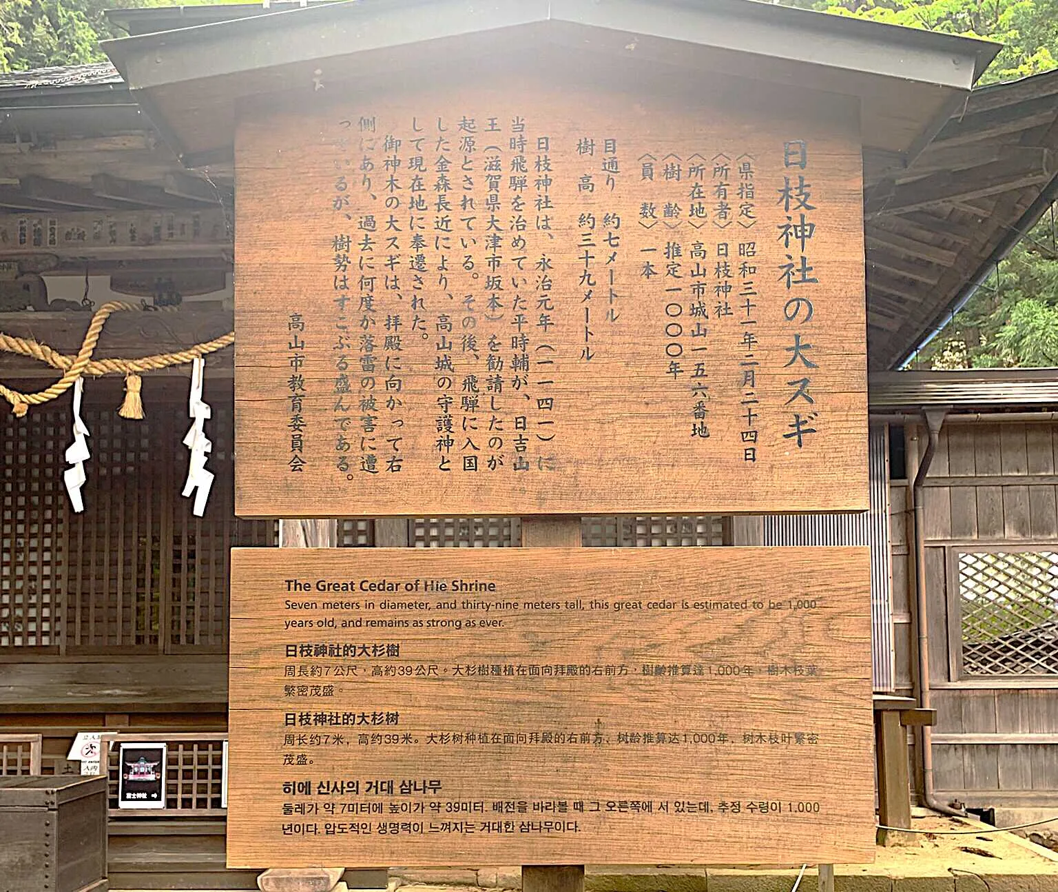 その後「二の鳥居」を潜って歩を進めると「拝殿」と「拝殿脇の大木」が目に飛び込んできます。拝殿向かって右側の大木は「スギの大木」で、「天然記念物の木」に指定されているとの事。つまり、上記引用にある、「飛騨山王宮 日枝神社の創建」にかかわった「樹齢1000年の大杉」と理解した次第です(※ 上記引用より:言い伝えによれば、平時輔が狩りを行なっていたところ、一匹の老狼を見つける。これを仕留めようと矢を射たが獲物は見当たらず、矢は大杉に深くつき立っていたという。平時輔は「大山咋神が、お使いである老狼を救われたものであろう」と神の力を感じ、鎮護神として近江国より日吉大神を勧請し、日枝神社としたという。この時の大杉が、日枝神社の大杉という)。その「大杉」のエネルギーを感じつつ、「拝殿」でご挨拶申し上げた感じでした。