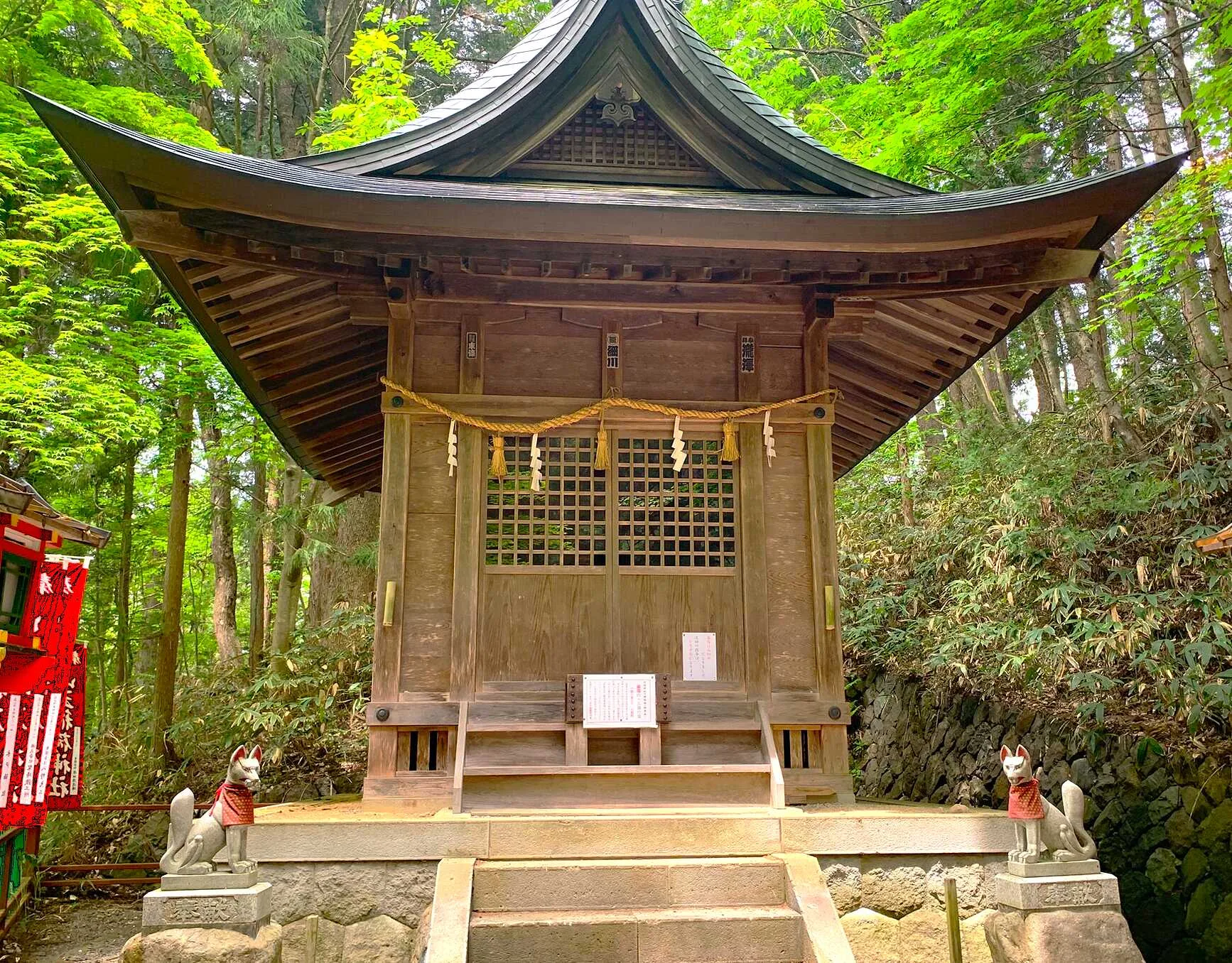「拝殿」でご挨拶申し上げた後は、拝殿向かって右側の「富士社」へ。上記引用には、「木花之佐久夜毘売命(このはなさくやひめ:天孫降臨を果たしたニニギの妻)」を、元々のご祭神とし、現在は「金刀比羅神社(祭神:大物主命(≒オオクニヌシ)・崇徳天皇(日本三大怨霊の1人))・恵比須神社(祭神 八重事代主神)を合祀」するとの事。「日本神話」や「日本三大怨霊」と言ったワード連想しつつ、「手の込んだ社殿」を拝見させて頂きました。その後「産霊社」・「本殿」(遠望ですが…)も拝見させて頂き、改めて「拝殿」の前を失礼しつつ、同じく境内末社の「天満神社」・「稲荷神社」に参り、それぞれご挨拶。「天満神社」は、上記「崇徳天皇」と同じ「日本三大怨霊」の1人で、「梅や牛に関連深い・菅原道真」を「学問の神」として祭る神社。「稲荷神社」は、皆様ご承知の通り「狐」を「神使」とし「五穀豊穣・商売繁盛」の神様を祭る神社。「という事で…」ではありませんが、「狛牛」・「狛狐」がしっかり守護していらっしゃいました。つまり、「日本神話」や「日本三大怨霊」、「狛〇」と言った視点でも、「大人散策@飛騨山王宮 日枝神社」を楽しませて頂いた次第でした。