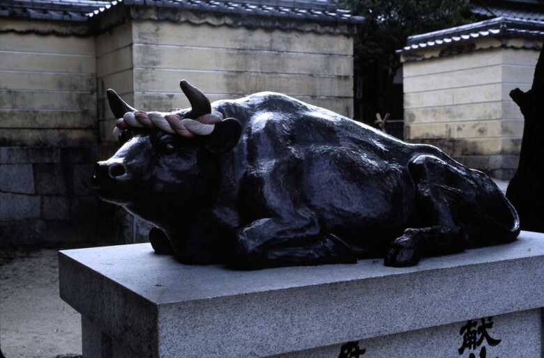 - のちに道真が神として祀られると、雷神であると同時に農業の守り神としても信仰されてきたが、農耕において牛は重要な働き手であることから、天満宮では神の使いとして信仰の対象となった。